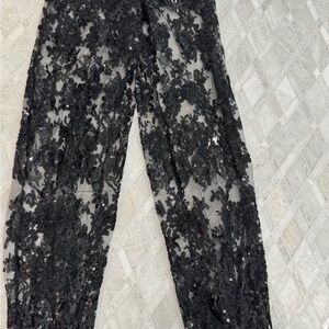 Chic black jumpsuit with sequin lace. Strapless design with sheer wide legs. Ideal for glamorous occasions.