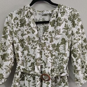 New with out tags. Retail hangtag attached, belt included, and buttons intact. on button the elastic loop to hook is broken needs to ve sewed see photos. small spot on back of shirt