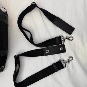 Materials: Black Nylon Exterior, Silver-Toned Hardware, Tonal Saffiano Leather Trim, Canvas Shoulder Straps, Purple Satin Lining Interior.