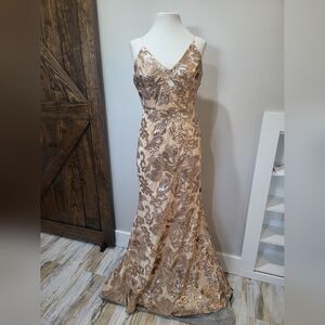Soft to the touch velour, covered in glittering rose gold sequins, shapes a princess-seamed triangle bodice, a high fitted waist, and a cascading mermaid-style maxi skirt. Adjustable skinny straps. Hidden back zipper/clasp.