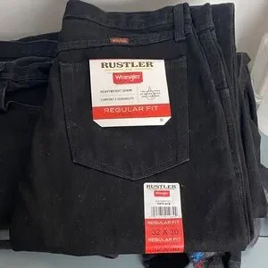Classic black jeans by Rustler. Straight leg and regular fit. Durable heavyweight denim.