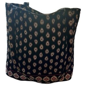 Classic Vera Bradley cotton tote in an elegant black-and-white paisley/medallion print with contrast border along the bottom. Lightweight and roomy with comfortable shoulder-length straps—perfect for everyday, work, school, travel, or the farmer’s market.