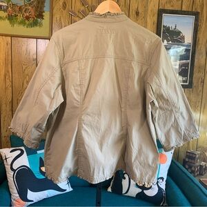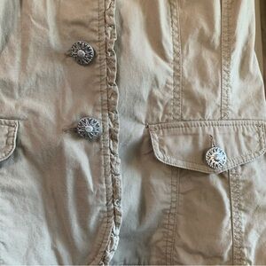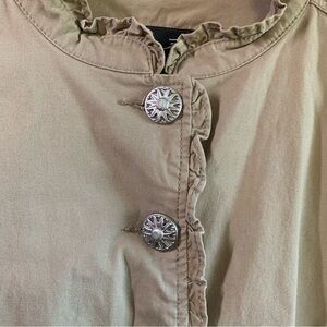 Buttons up front; fluted sleeves; button front pocket detail. Ruffles on collar, cuffs and hem. In great condition.