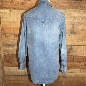 Madewell snap button western denim shirt in a women’s size XXS. With a classic Western design, complete with snap buttons and a seamed yoke, this long sleeve shirt would be a great addition to any wardrobe. Pre-loved great condition. Cotton and Hemp blend.