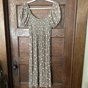 Neuflora Tan Cream Floral Dress Smocking Prairie Cottage Core Sz M Milk Maid