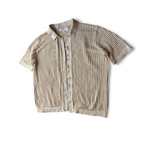 off white, open knit, camp shirt, woven texture, collared, cotton fabric, short sleeves, casual summer, retro style, neutral tones
