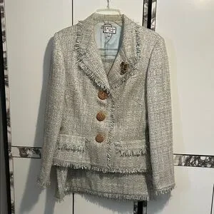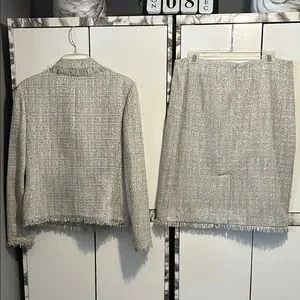 Elevate your style with this chic tweed skirt set, featuring elegant fringe accents and decorative buttons. Perfect for a sophisticated look.