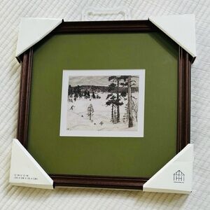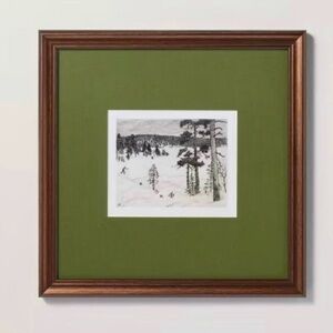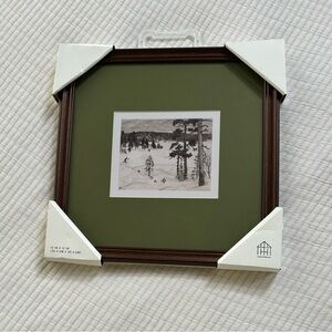 Hearth & Hand with Magnolia charming countryside forest and skier scene in a dark brown frame. Olive green mat board adds depth. Measures 12”x 12”. Christmas 2024. New with tags, in original box. Box has small signs of wear. Ready for this holiday season!