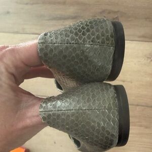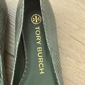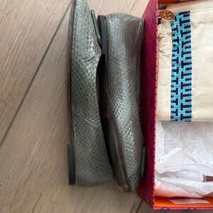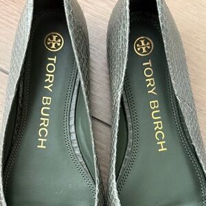 Lightly worn (once-twice) elegant palm green flats with signature logo detail. Perfect for versatile styling. Size 7M. Includes original box and dust bag. No signs of wear other than bottom of shoe.