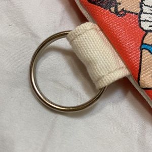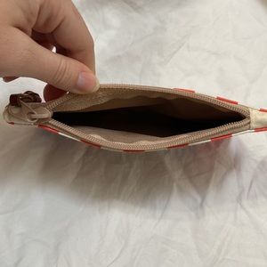 Like new. Perfect gift for the Holidays. Depicts a vintage looking cocktail party. The stripes are coral in color. 100% cotton. The bag has a small key ring on the outside of the clutch. The zipper has a small leather strap to help open and close the case. Approximately 7 x 4.5 inches.