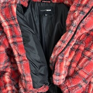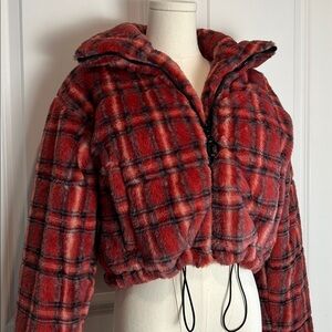 Cozy Plaid Red Women's Faux Fur Jacket size Small