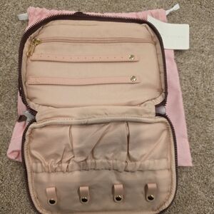 Practical, pretty, and oh-so-organized! With two separate compartments, one for your cosmetics and one for your jewelry, you get the perfect companion all in one case. The main compartment has plenty of room for all your lotions and potions, and features a wipeable lining, mesh pockets and a zipper pocket. The front compartment is a jewelry case with dedicated spots for your rings, necklaces, and delicate items, all kept safe with a zipper pocket. This is the beauty bag your holiday glam routine has been waiting for!