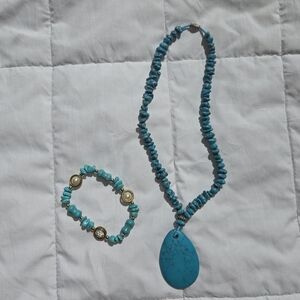 Beautiful turquoise beaded necklace with matching bracelet. Features a large turquoise pendant and gold accents.