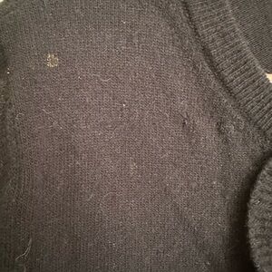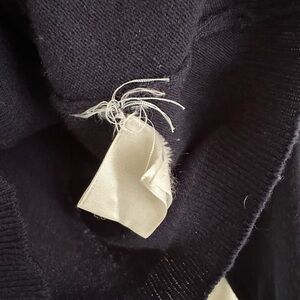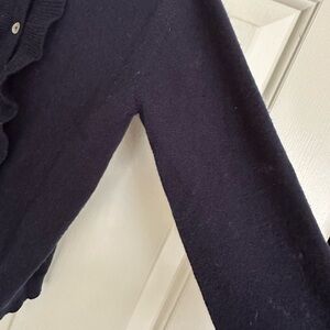Well loved condition Oscar de la Renta kids navy blue cardigan, size 5. Features ruffled accent. See photos for small repairs and untreated stains. From a low scent, smoke free home.