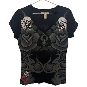 Vintage Ed Hardy Skull and roses vneck women's tshirt size large