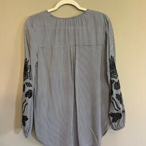 Vera Wang Black White Striped Blouse Floral Embroidered Sleeves Women's S EUC