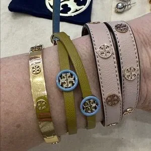 Elegant bracelets featuring gold, olive, and beige leather. Iconic Tory Burch design.