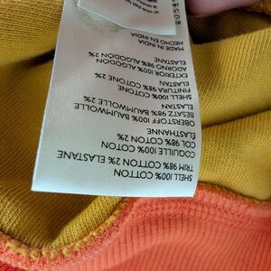Stylish colorblock sweatshirt featuring vibrant orange and yellow hues. Perfect for casual wear.