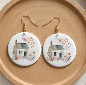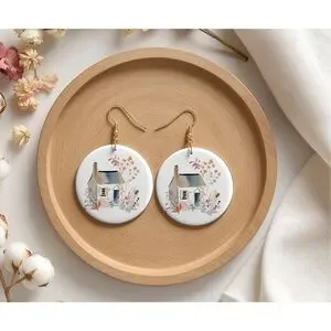 Beautiful round earrings featuring a cottage and floral design. Perfect for adding a touch of whimsy to any outfit.