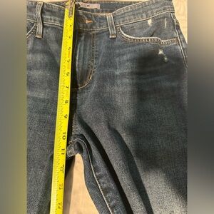 Chic dark blue boyfriend jeans with distressed details. Rolled cuffs for a relaxed style.