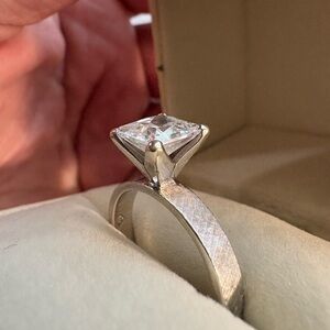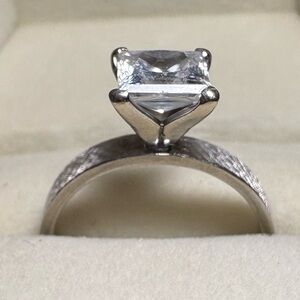 My dad got this ring back in 1970. When I got married in 2017 we replaced the smaller diamond with a 2 ct moissanite diamond. The stone is GORGEOUS! The bands are made of 14k white gold. Whoever purchased this set is getting a one of a kind really good deal! When we went to go find a matching band for my husband we just couldn’t get an exact match of this ring. The jeweler said it was an etching technique that jewelers no longer know how to do?