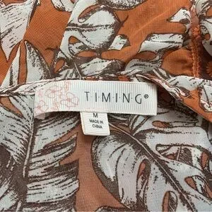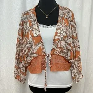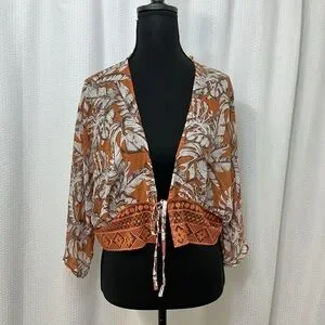 Chic tie blouse with vibrant leaf design. Features a tie front.