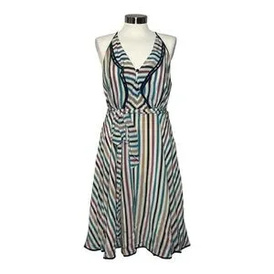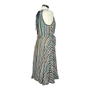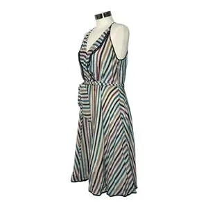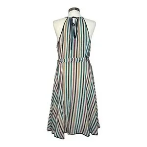 Effortlessly chic and perfect for warm-weather days, this Girls from Savoy dress features a vibrant multicolor vertical stripe print on lightweight 100% silk. Designed with a flattering halter neckline and a subtle ruffle trim, it cinches at the waist with a matching tie belt for a feminine silhouette. The knee-length A-line skirt adds a playful, breezy vibe ideal for vacations, brunches, or garden parties. Side zip closure.