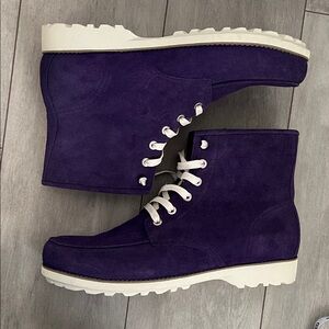 Step out in style with these sleek purple suede men's boots. Perfect for any occasion, these boots offer both comfort and elegance. Dark purple suede upper, white laces and rubber sole. Brand new condition.