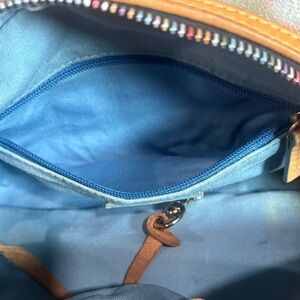 Perfect for Valentines Day and date night! Vintage Dooney & Bourke Rainbow Hearts MINI dome satchel with rainbow hardware! Lindsay Lohan’s collab with DB. So cute and on trend! Overlay on canvas is not yellow but does show separation. Leather is great. See photos. One tiny ink mark on handle. Inside is clean but has discoloration and a few small holes in liner. Bottom zip compartment is clean and all zippers on bag work great. Adorable and fun print! Two zippered compartments outside and one inside. Key strap with clip. Such a cute collector piece. Holds essentials easily and phone fits in the bottom compartment