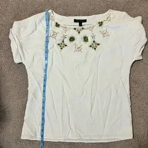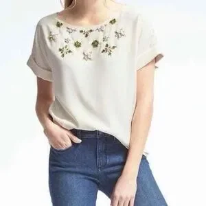 Elevate your everyday style with this gorgeous Banana Republic short-sleeve top. Crafted from soft, breathable cotton in a crisp white hue, it features intricate floral embellishments with hints of green and metallic detailing around the neckline. The flattering silhouette includes subtle side ruching, adding a touch of femininity. Perfect for pairing with jeans or a skirt for a polished, spring-ready look!