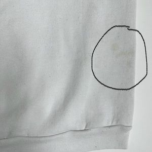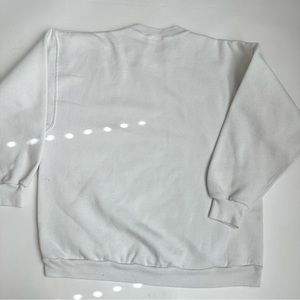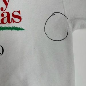 This vintage ugly Christmas sweatshirt is showing some general wear. There are a few light stains as shown in photos, the tag has been cut out, and it’s no longer a bright white color sweatshirt. The sweatshirt says Merry Christmas (pass it on) from Peacock Papers. It’s a white sweatshirt with red lettering and green garland and holly. The tag has been cut out so see below measurements carefully to insure best fit. Mostly likely 50% cotton and 50% polyester. Most likely a size L. Note: The white spots are from photographing near a window with blinds. Christmas
