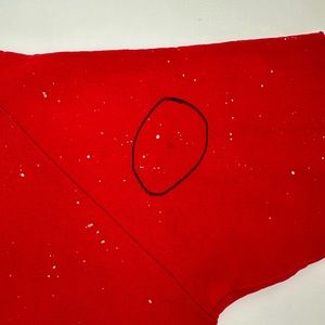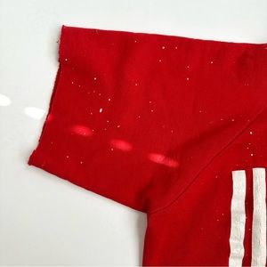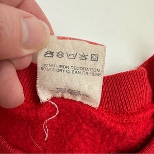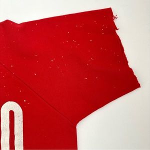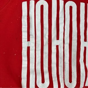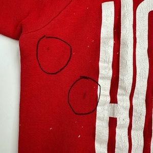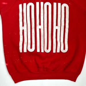 This is a vintage, made in the USA Christmas / holiday sweatshirt. It’s in pretty good vintage condition, but, it has been altered from its original form. First, the arms have been cut off, so it looks a bit like a gym or wrestling shirt. Someone has also splashed white paint on it to make it look like snow. Personally, I like this touch. As for flaws, there are a few stains as shown in photographs. All that said, I do think that this is a great holiday or Christmas sweatshirt. It says HoHoHo. The white lettering is cracked. It’s printed on a Fruit of the Loom sweatshirt that is 50% cotton and 50% polyester. Made in USA. This is a vintage top. Please check measurements carefully as vintage fits differently. It’s marked an XL but might better fit a size L. Christmas
