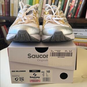 Saucony and J. Crew collaboration. Ride Millennium Women's Metallic Gold and Silver Sneakers Size 10. New in original box and packaging. Never got around to wearing.