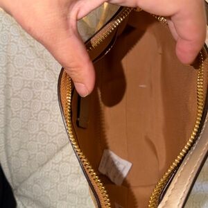 Chic Coach crossbody with signature pattern. Stylish tan color. Perfect for daily wear.