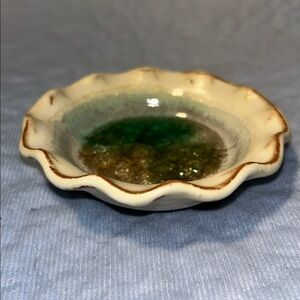 Preowned This is a handmade art pottery trinket dish or Ashtray with a crackle glass center. Measures Approximately 3 1/2 inches wide by 1 inch tall. Has no cracks or chips. Ruffle pattern around the edges. Has a rusty look with green white brown gold and speckled look to it with a Stoneware bottom.