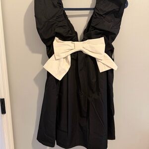 Never worn elegant black dress with a striking cream bow. Perfect for evening wear. Features a flattering silhouette.