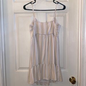 Stylish dainty flowy dress with button closure. Features cream and tan stripes.