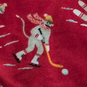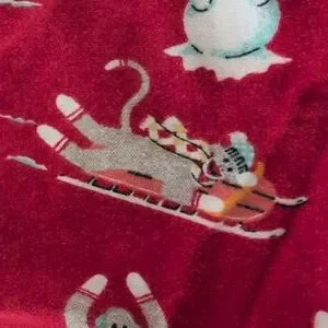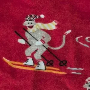 Fun print! Red background with sock monkeys doing winter activities (skiing, sledding, ice skating, hockey, etc)