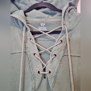 Aerie oversized lace up criss cross tie hooded sweatshirt green cotton, side slits, ribbed cuffs & rolled hem