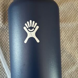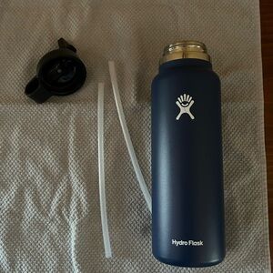 Stylish Hydro Flask in deep blue. Features a robust design with a secure black lid. Comes with 2 straws