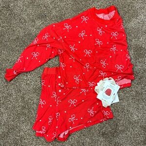 Cozy red pajamas with a cute bow print. Perfect for Christmas morning! I got this set in a different color and love them, but didn’t return this set in time. New without tags. So soft!
