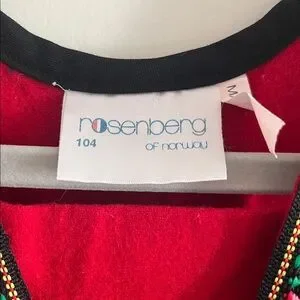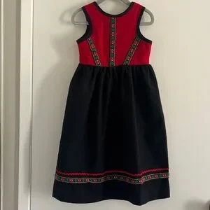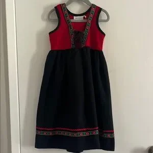 Traditional style Scandinavian dress / Norwegian bunad with red and black color scheme. Purchased in Norway about 10 years ago, kids have outgrown it so time for a new home. Works as a dirndl for Oktoberfest, or even as Anna from Frozen. Features detailed embroidery. 27” long, 11” across chest. European size 104 = approximately 3-4T.