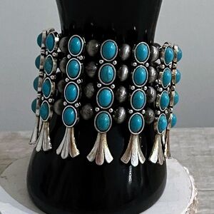 This stunning bracelet and ring set features vibrant turquoise stones set in a sleek silver design. Perfect for adding a pop of color to any outfit.