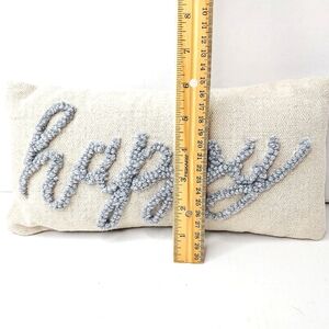 "Happy" embroidered throw pillow. 12" Wide by 6" high, back hidden zipper on cover. Cover fabric is heavy cotton or canvas in a cream or off white. This includes pillow insert. Carpet type yarn embroidered "happy" is in a gray blue.