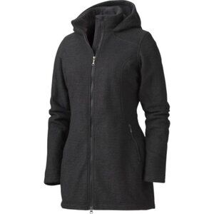 Excellent, very gently used condition. No stains, holes, or other issues. Outside is a felted wool-blend fleece; inside is soft fleece lined. Wind resistant. Attached/fixed hood. Full-length, two-way zipper at the front. Two zippered hand warmer pockets, one internal zippered pocket at chest. All zippers in perfect working order. Measurements are approximately 19” at bust (measured pit-to-pit) and 30” in length (measured down center back from collar seam).