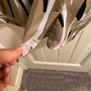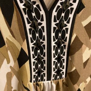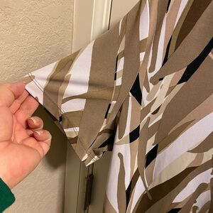 Up for auction is a size large, Dana Buckman stretch blouse. It has brown black and white colors and black beads on the neckline. It measures 21 inches across the front of the chest armpit to armpit and 26 inches from the top of the shoulder to the bottom of the blouse. Great shape! Pretty!