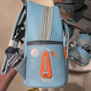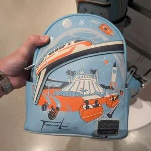 Loungefly backpack with Tomorrowland design. Features blue, orange, and white colors.