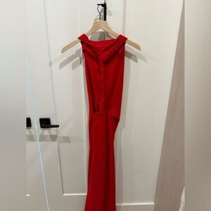 Chic red dress by Proenza Schouler. It’s an elevated gown with a high cowl neck and twisted T shaped back