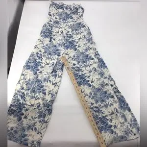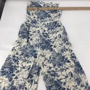 Stylish jumpsuit with a cream base and blue floral pattern. Features delicate straps for a modern look for women in excellent condition..