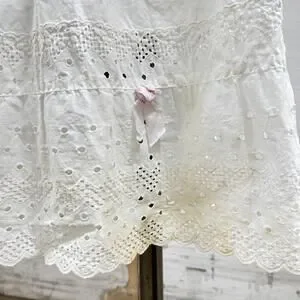 White cotton half slip with beautiful tiered eyelet lace hem and scalloped edge. Elastic waist. Pastel pink bow detail. Slight discoloration at hem as shown, priced accordingly. Gorgeous vintage undergarment or layering piece.